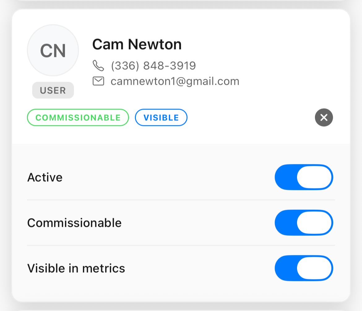 In addition to managing whether an employee is active, you can control whether they are commission-eligible (on by default) and whether they appear in metrics.